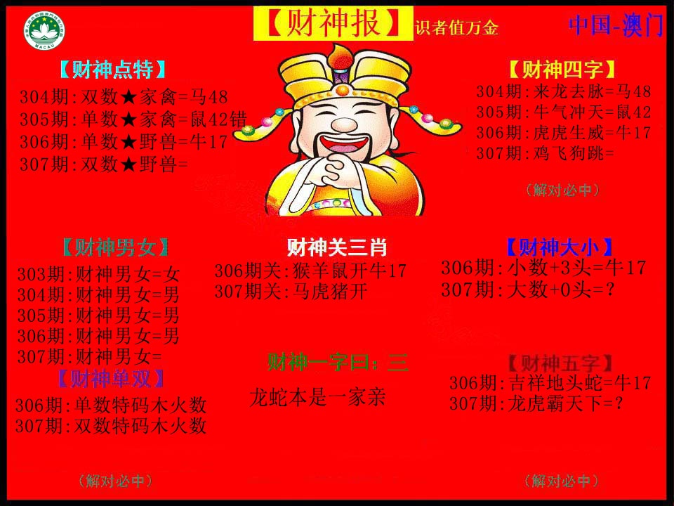 | 307期 | 〖蛇兔猴牛龙马〗实现梦想的强料 | 开:?00准 |